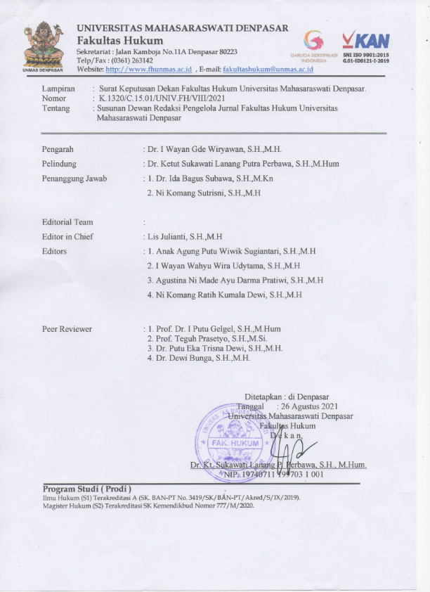 Pelindung : Dr. Ketut Sukawati Lanang Putra Perbawa,SH.M.Hum