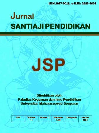 Vol. 11 No. 1 (2021)Jurnal Santiaji Pendidikan (JSP) with registration number ISSN 2087-9016 is a journal that contains publications in the form of research results and literature review in the field of education. JSP was published in January 2011 by the Teaching and Education Faculty of Mahasaraswati University, Denpasar. JSP is published twice a year in March and July.