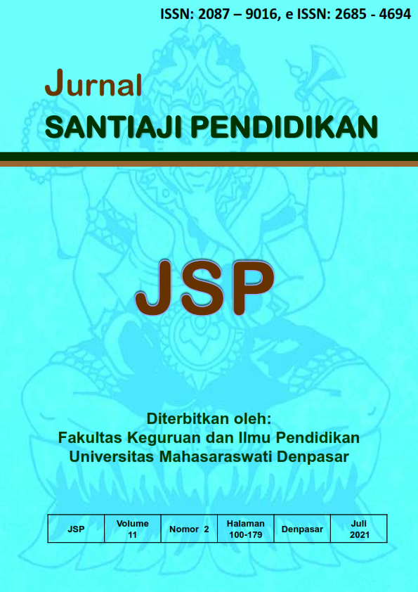 Vol. 11 No. 2 (2021)Jurnal Santiaji Pendidikan (JSP) with registration number ISSN 2087-9016 is a journal that contains publications in the form of research results and literature review in the field of education. JSP was published in January 2011 by the Teaching and Education Faculty of Mahasaraswati University, Denpasar. JSP is published twice a year in March and July.