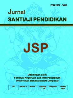 Vol. 8 No. 1 (2018)Jurnal Santiaji Pendidikan (JSP) with registration number ISSN 2087-9016 is a journal that contains publications in the form of research results and literature review in the field of education. JSP was published in January 2011 by the Teaching and Education Faculty of Mahasaraswati University, Denpasar. JSP is published twice a year in January, and July.