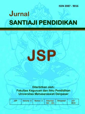 Vol. 9 No. 2 (2019)Jurnal Santiaji Pendidikan (JSP) with registration number ISSN 2087-9016 is a journal that contains publications in the form of research results and literature review in the field of education. JSP was published in January 2011 by the Teaching and Education Faculty of Mahasaraswati University, Denpasar. JSP is published twice a year in January, and July.