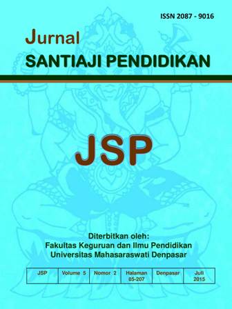 Vol. 5 No. 2 (2015)Jurnal Santiaji Pendidikan (JSP) with registration number ISSN 2087-9016 is a journal that contains publications in the form of research results and literature review in the field of education. JSP was published in January 2011 by the Teaching and Education Faculty of Mahasaraswati University, Denpasar. JSP is published twice a year in January, and July.