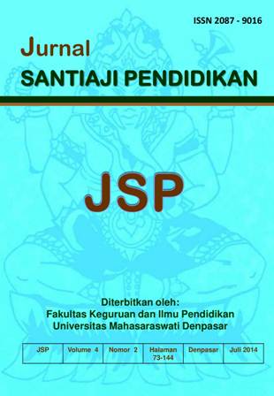 Vol. 4 No. 2 (2014)Jurnal Santiaji Pendidikan (JSP) with registration number ISSN 2087-9016 is a journal that contains publications in the form of research results and literature review in the field of education. JSP was published in January 2011 by the Teaching and Education Faculty of Mahasaraswati University, Denpasar. JSP is published twice a year in January, and July.