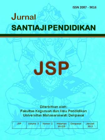 Vol. 3 No. 2 (2013)Jurnal Santiaji Pendidikan (JSP) with registration number ISSN 2087-9016 and e-ISSN 2685-4694 is a journal that contains publications in the form of research results and literature review in the field of education. JSP was published in January 2011 by the Teaching and Education Faculty of Mahasaraswati University, Denpasar. JSP is published twice a year in January, and July.