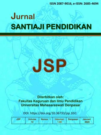 Vol. 10 No. 1 (2020)Jurnal Santiaji Pendidikan (JSP) with registration number ISSN 2087-9016 is a journal that contains publications in the form of research results and literature review in the field of education. JSP was published in January 2011 by the Teaching and Education Faculty of Mahasaraswati University, Denpasar. JSP is published twice a year in January, and July.