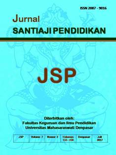 Vol. 7 No. 2 (2017)Jurnal Santiaji Pendidikan (JSP) with registration number ISSN 2087-9016 is a journal that contains publications in the form of research results and literature review in the field of education. JSP was published in January 2011 by the Teaching and Education Faculty of Mahasaraswati University, Denpasar. JSP is published twice a year in January, and July.