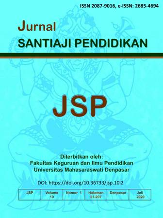 Vol. 10 No. 2 (2020)Jurnal Santiaji Pendidikan (JSP) with registration number ISSN 2087-9016 is a journal that contains publications in the form of research results and literature review in the field of education. JSP was published in January 2011 by the Teaching and Education Faculty of Mahasaraswati University, Denpasar. JSP is published twice a year in January, and July.