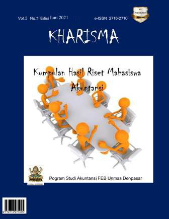 Vol. 3 No. 3 (2021)KHARISMA adalah jurnal ilmiah yang diterbitkan oleh Program Studi Akuntansi Fakultas Ekonomi dan Bisnis Universitas Mahasaraswati Denpasar yang bertujuan untuk mempublikasikan informasi hasil penelitian akuntansi. Lingkup penelitian akuntansi yang dimuat dalam KHARISMA meliputi akuntansi keuangan, akuntansi manajemen, akuntansi sektor publik, auditing, sistem informasi, pasar modal, dan perpajakan. KHARISMA diterbitkan secara berkala 3 kali setahun (Februari, Juni dan Oktober)