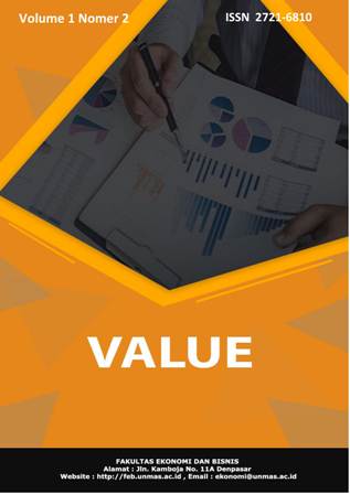 Vol. 2 No. 2 (2021)VALUE is a scientific journal for the development of management science published by the Management Study Program of the Faculty of Economics and Business, Mahasaraswati University, Denpasar. This journal is a means of publication of research results of lecturers and undergraduate students in improving the quality of higher education research. This journal contains articles related to Management Science. The publication of this journal was carried out three times in his knowledge in April, August and December.